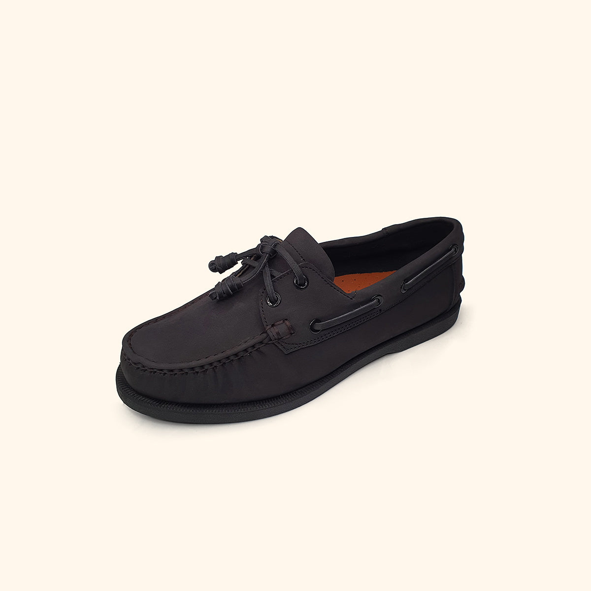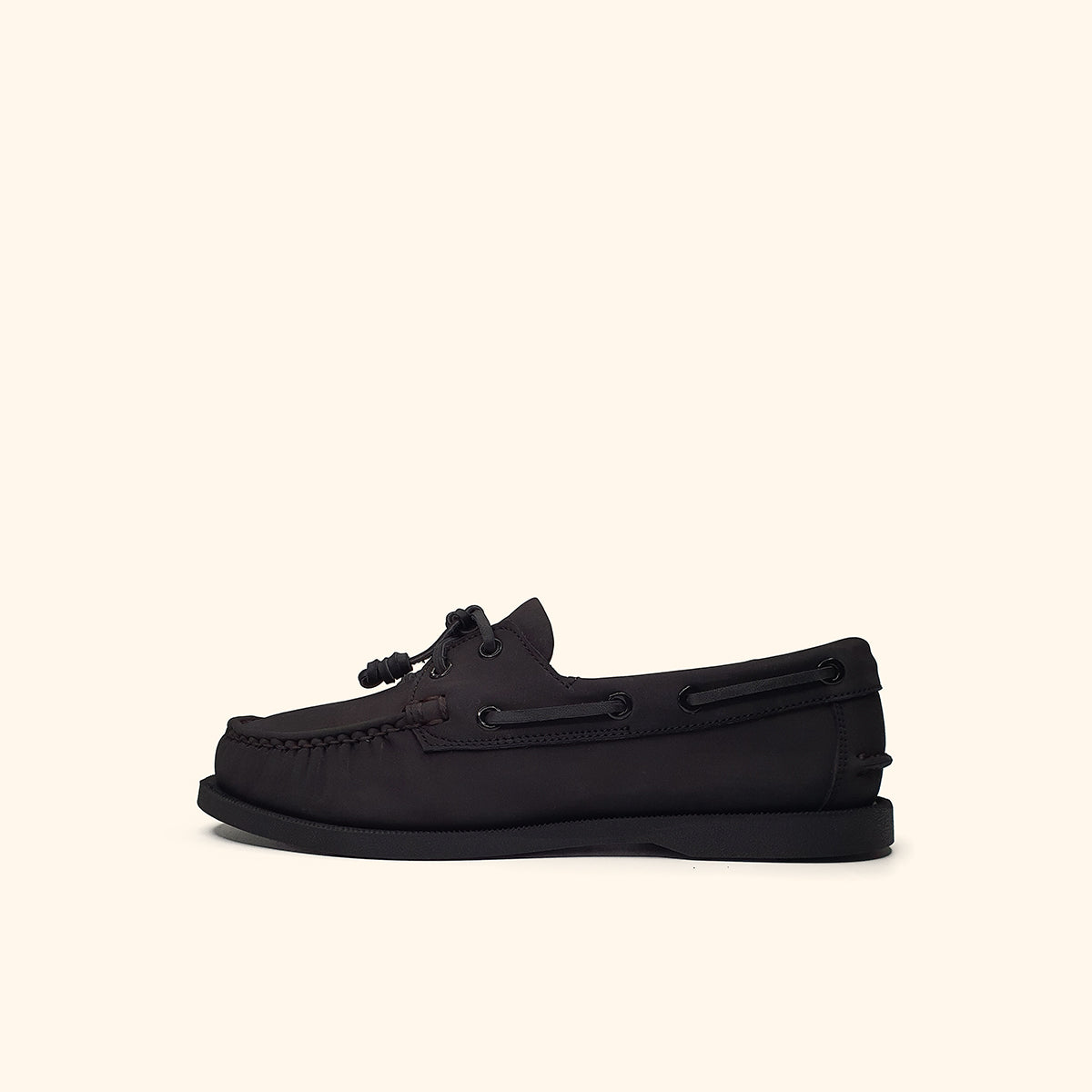 Black genuine leather boatshoes with black sole for men.
