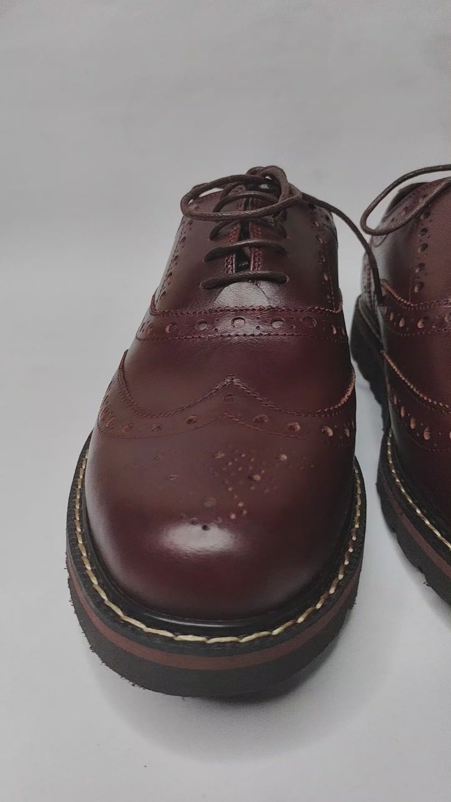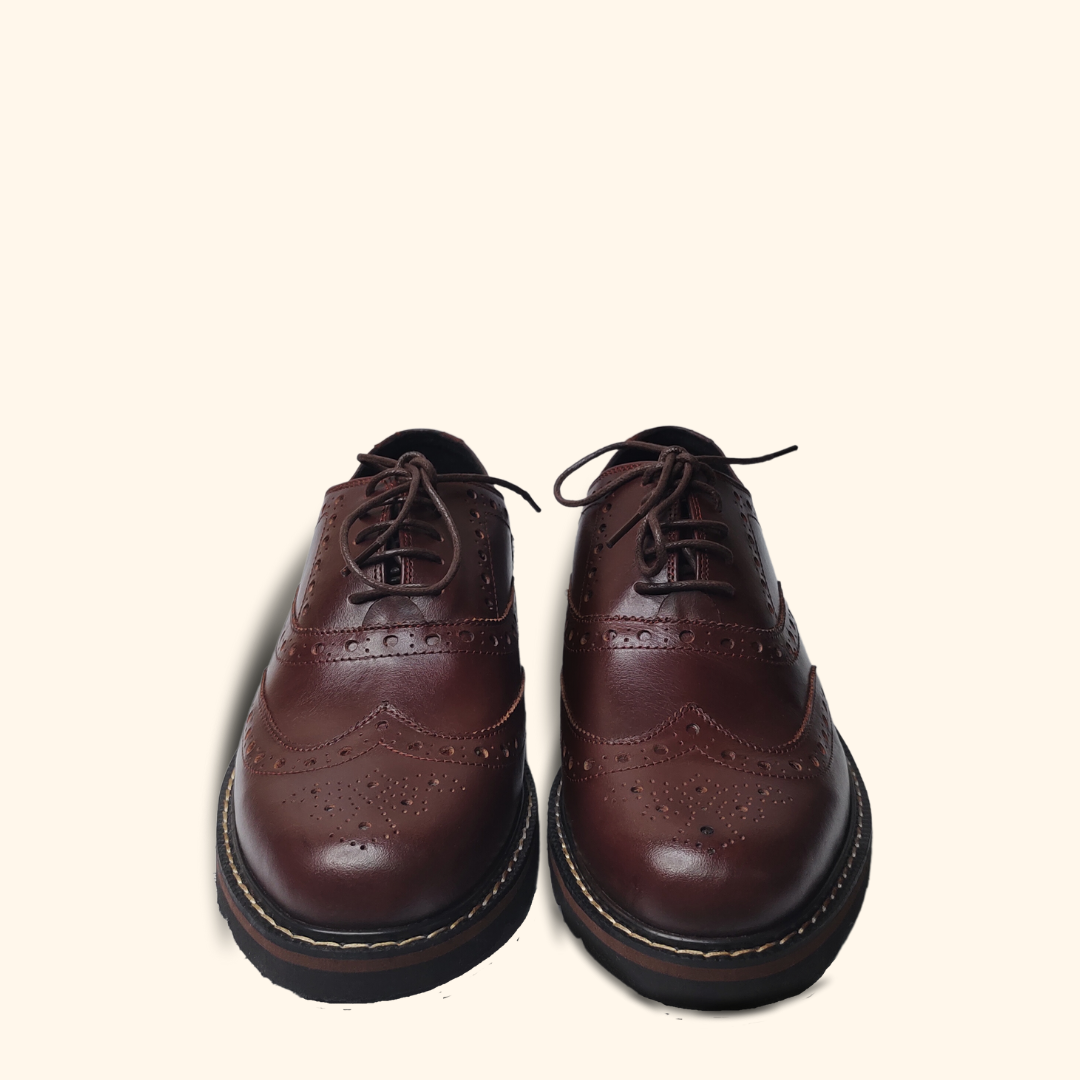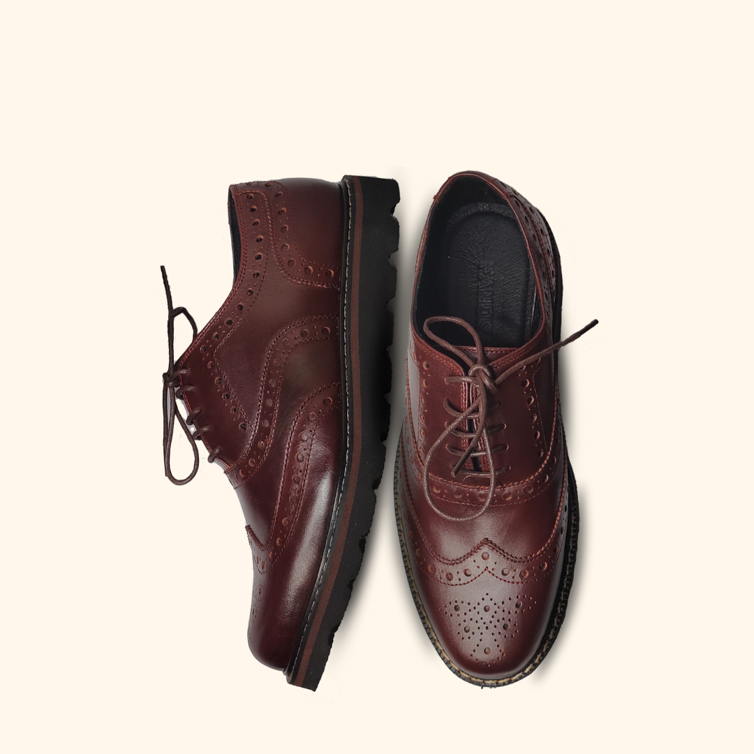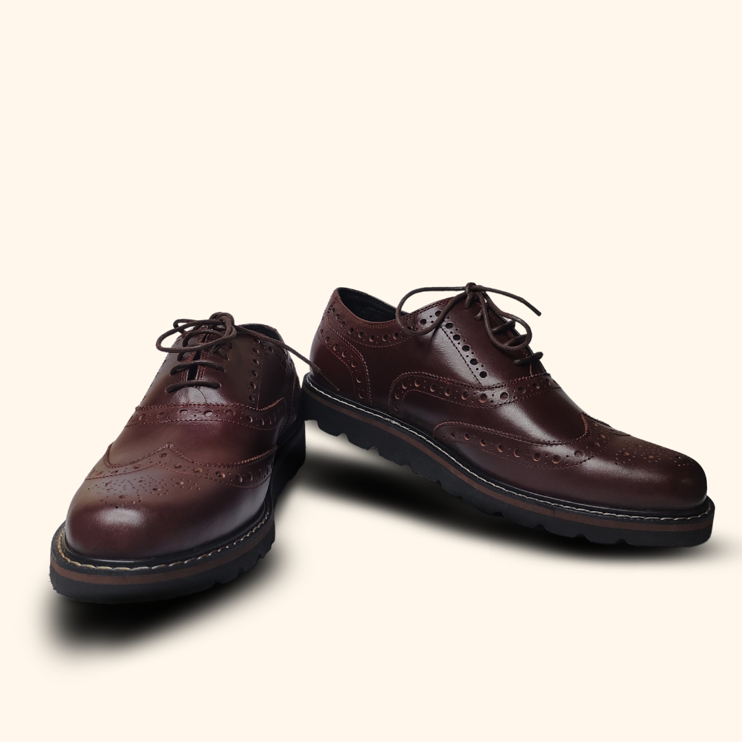 Dark chestnut genuine leather wingtip with black and brown EVA sole for men.