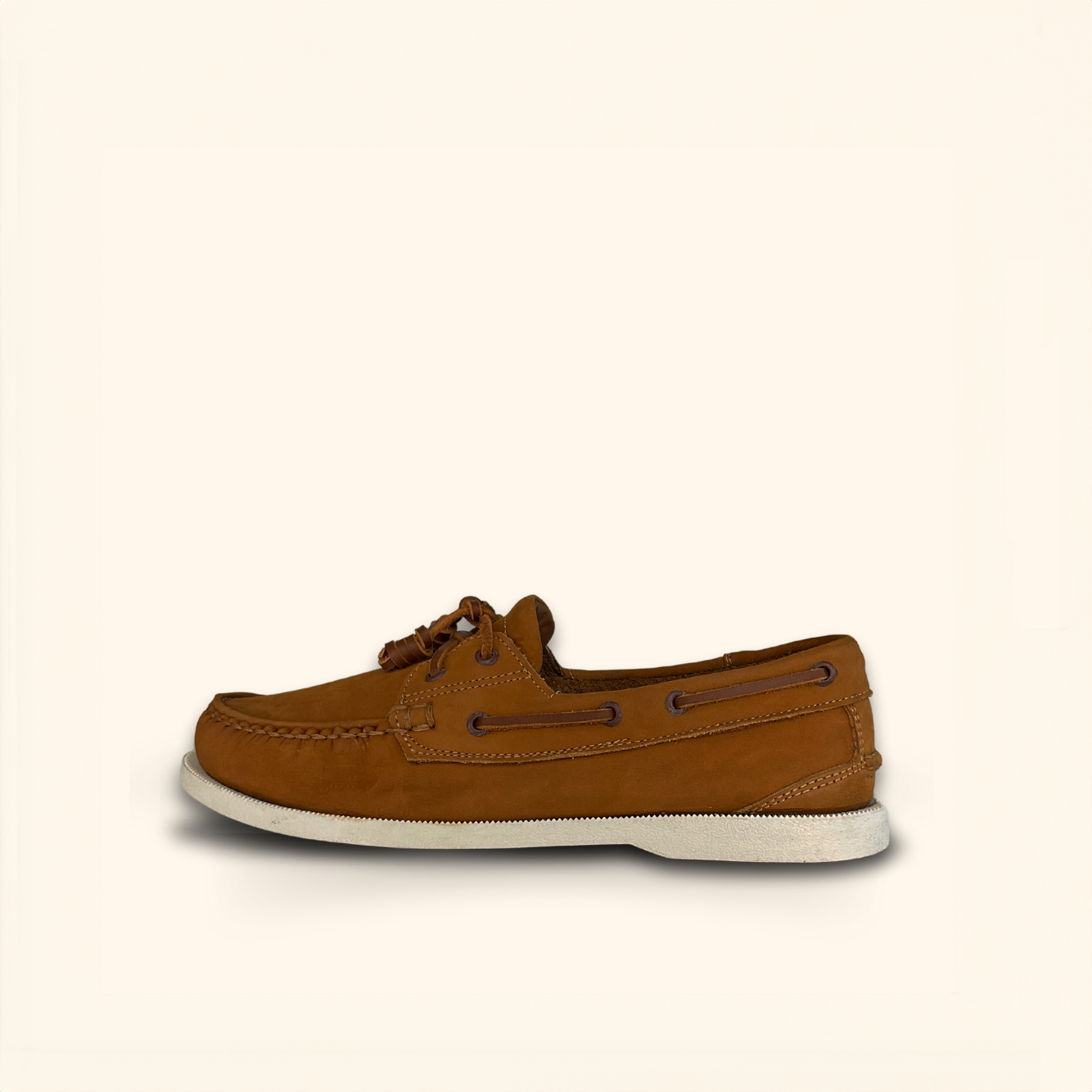 Crazy horse tan genuine leather boatshoes with white sole for women.