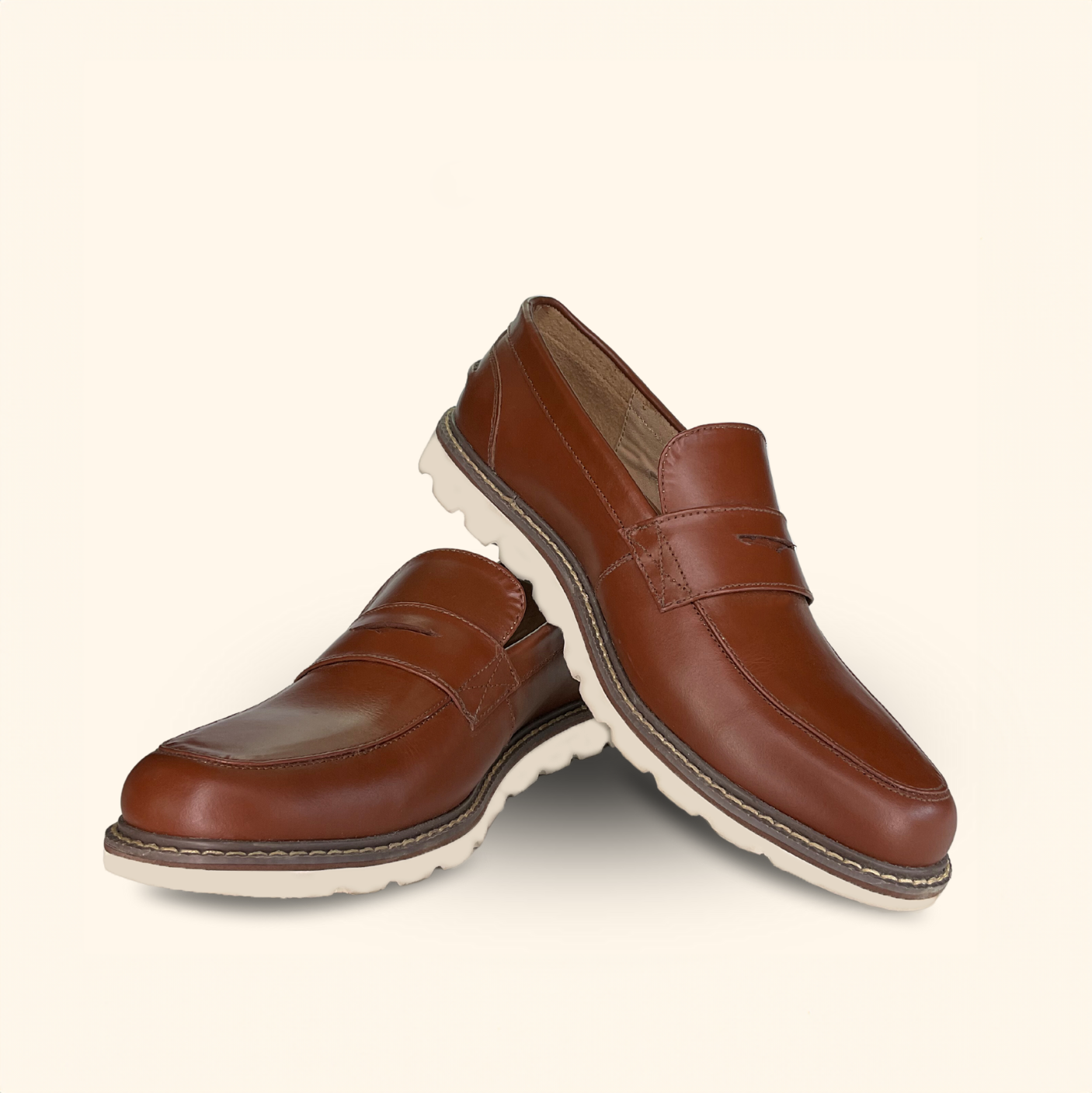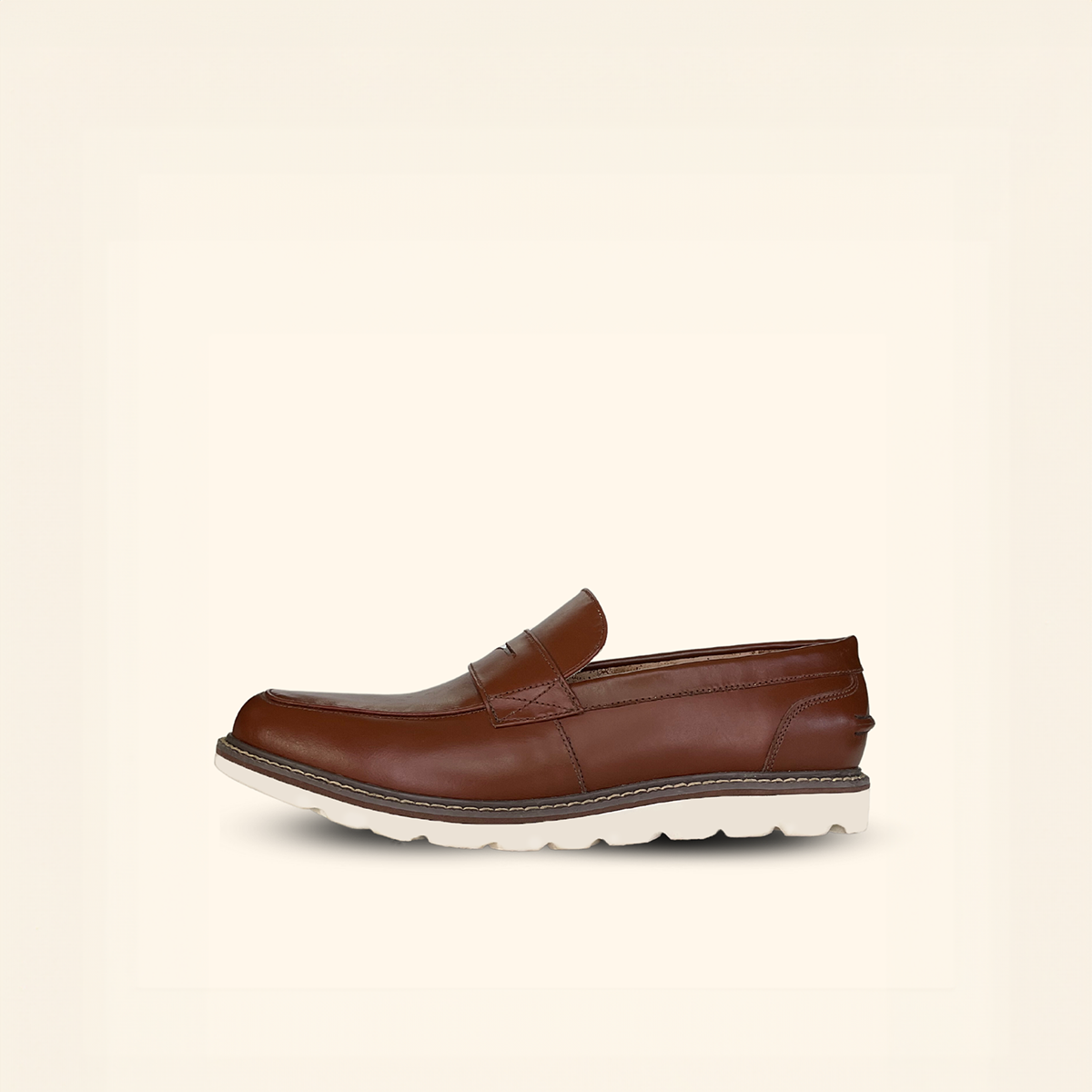 Brown genuine leather penny loafers with soft white EVA outsole for men.