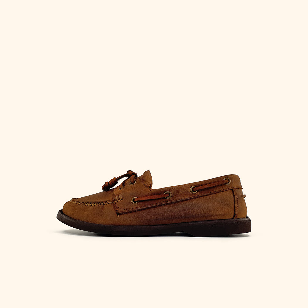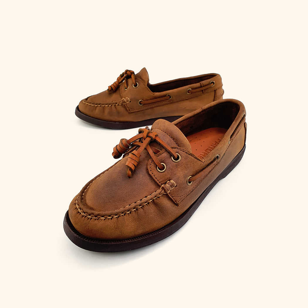 RORY Boatshoes. Oily pull up genuine leather brown boatshoes with dark brown sole for men.