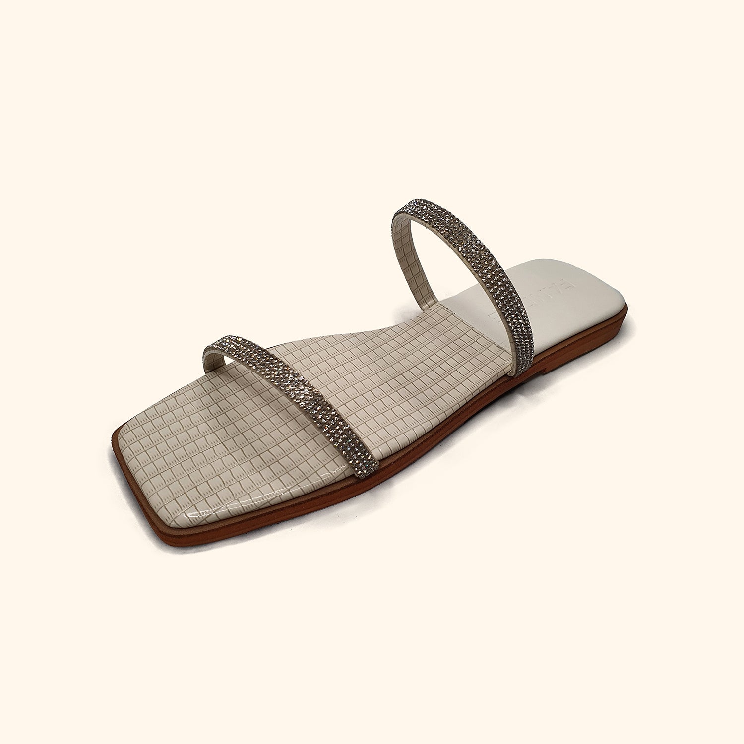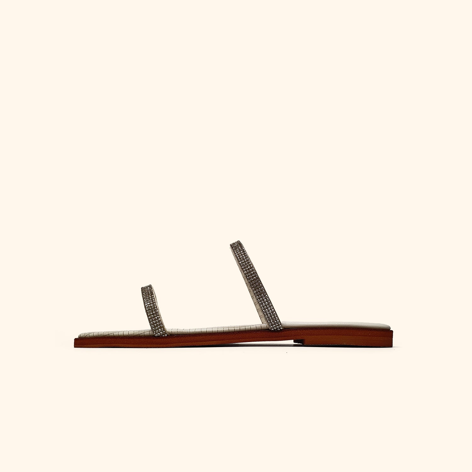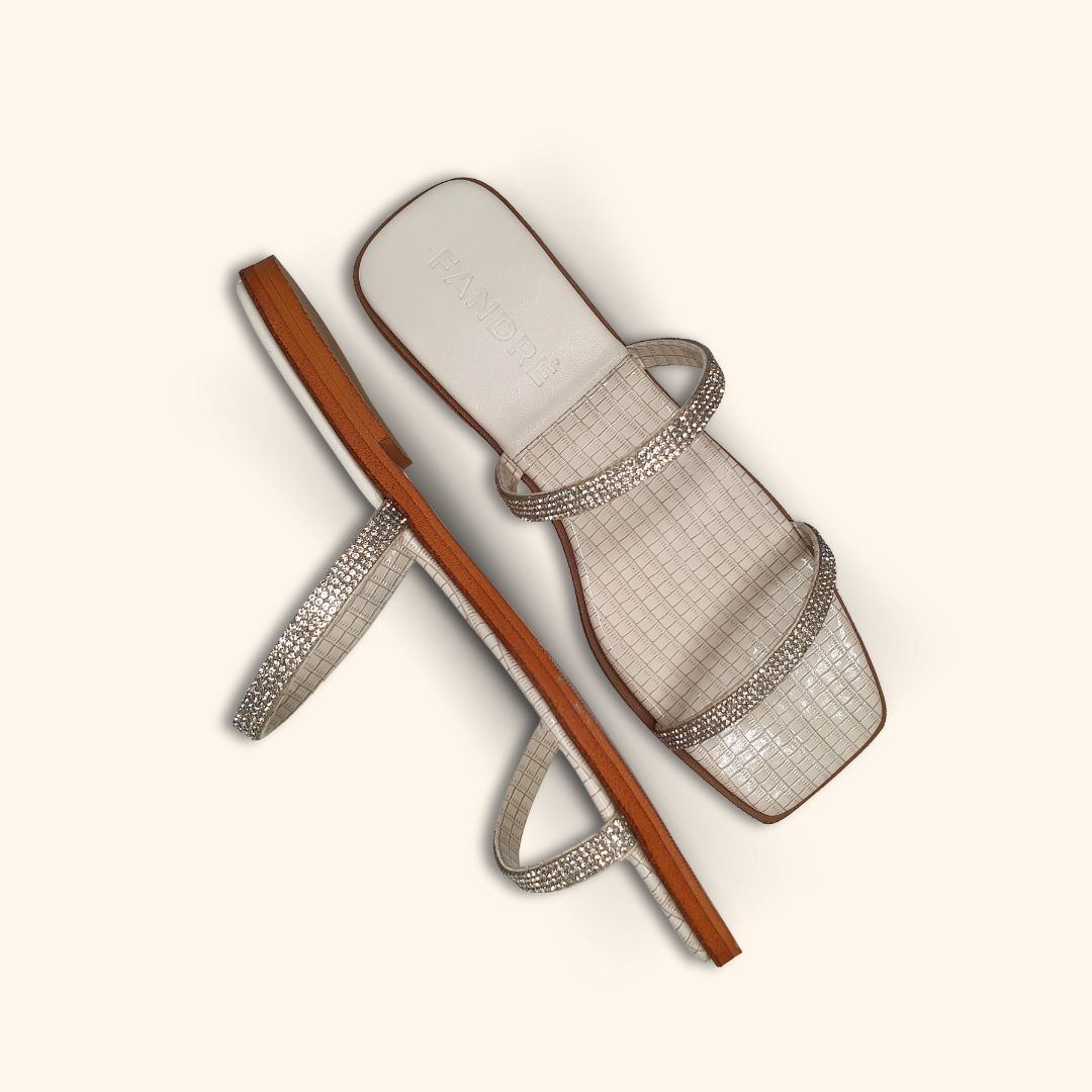 Premium leather quality flat sandals with shining straps and front croc footbed for women.