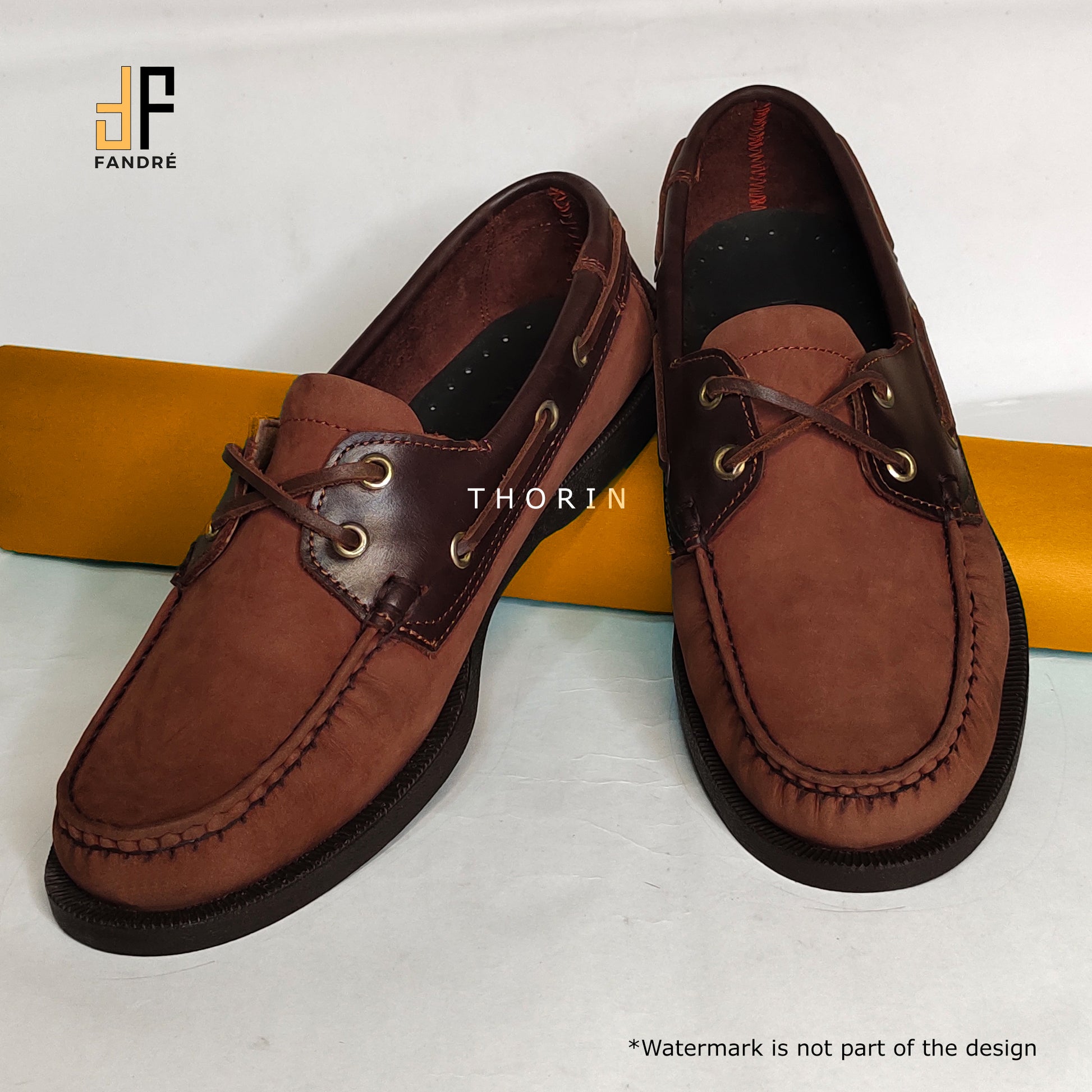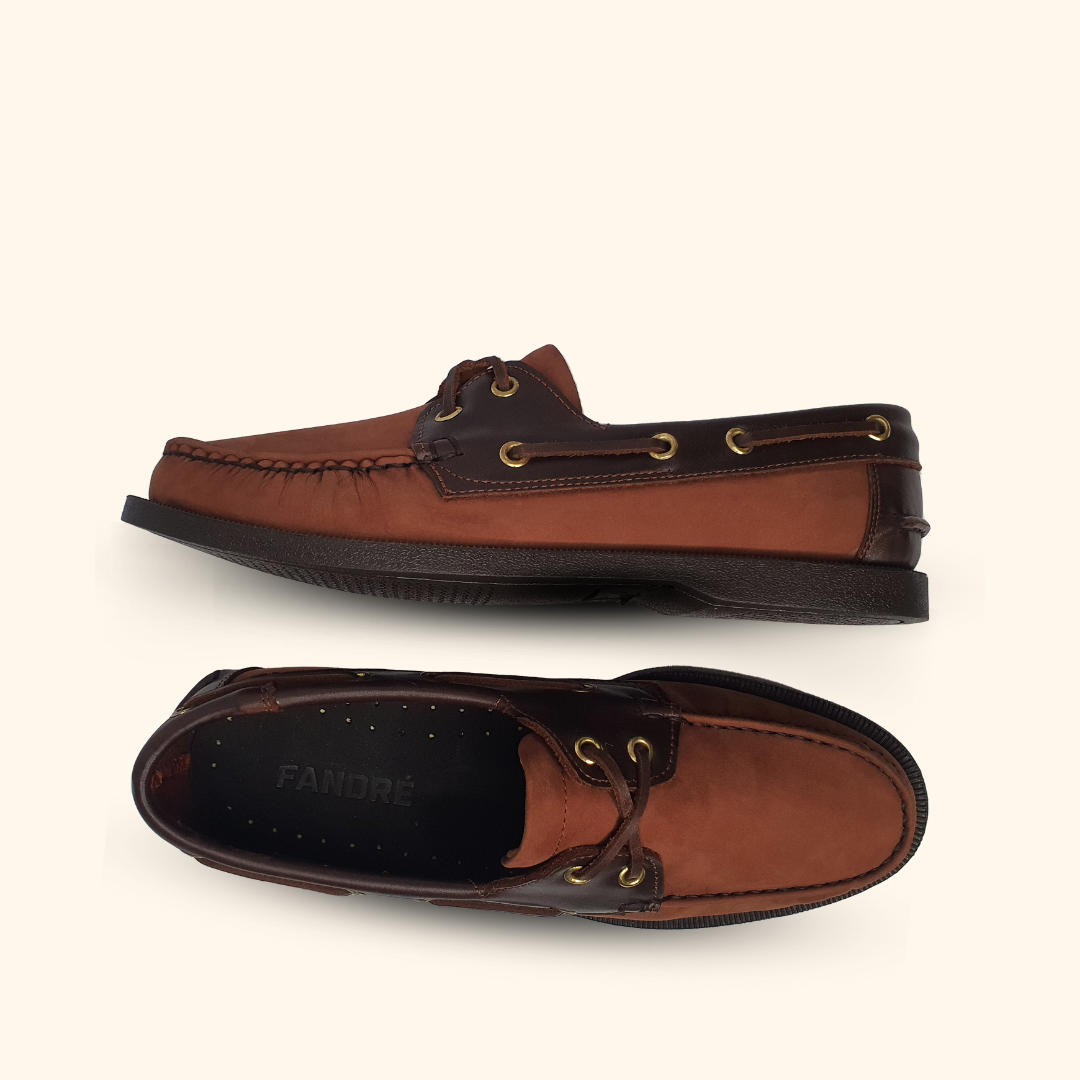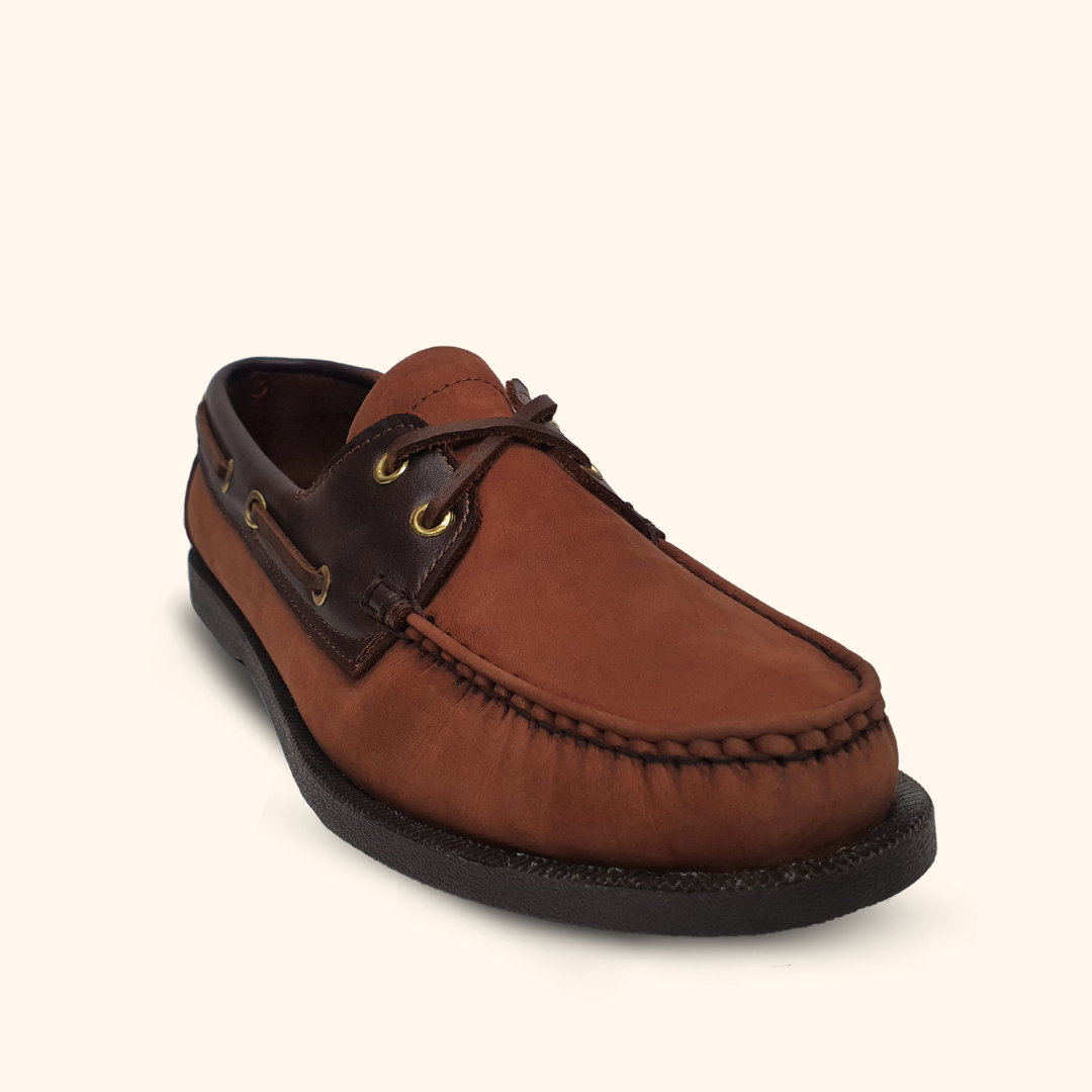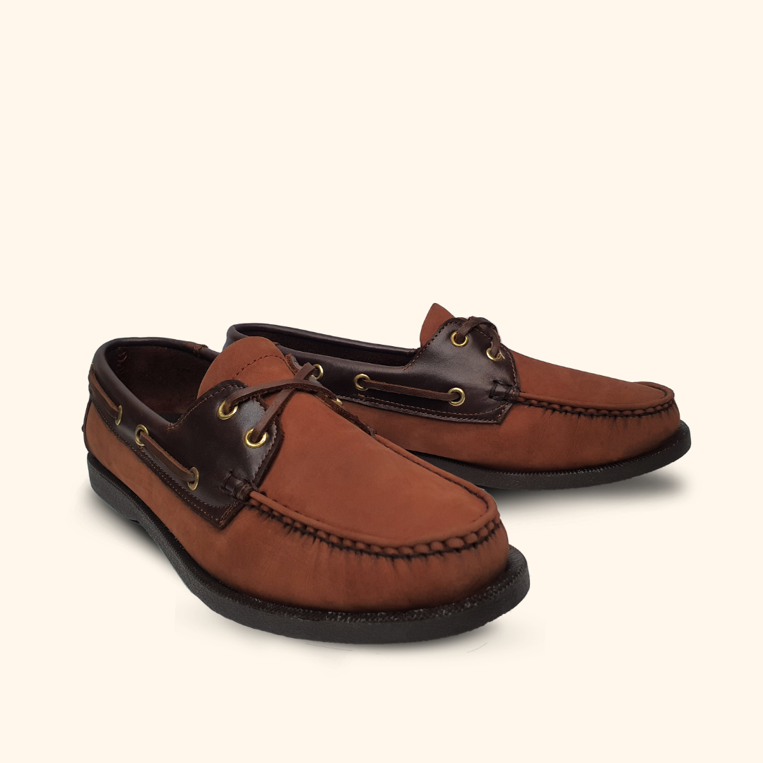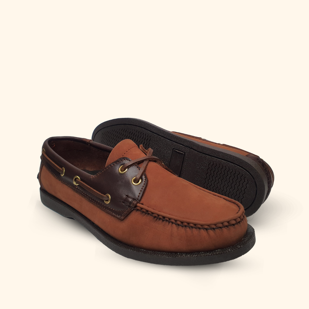 Brown two-tone nubuck genuine leather boatshoes with black rubber sole for men.